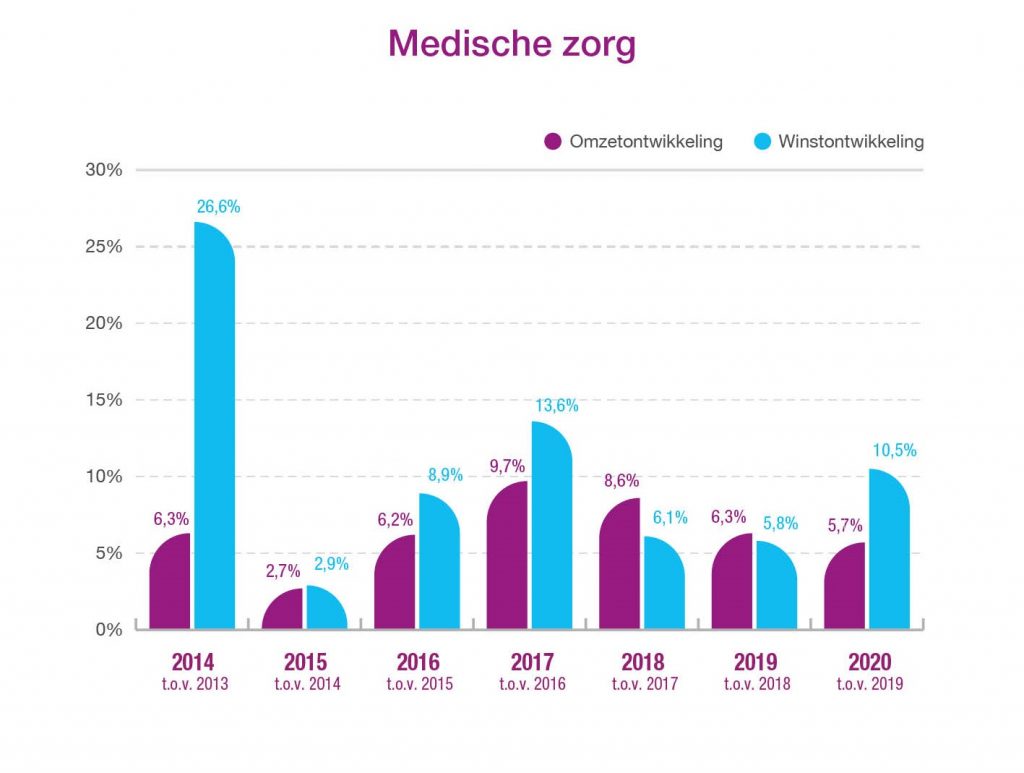 In totaal bedroeg de winstgroei van mkb-ondernemingen in de zorg 10,5 procent in 2020. Ruim 45 procent van de zorgondernemers zag de winst afnemen en bij 14 procent daalde de winst zelfs meer dan 50 procent. Aan de andere kant steeg de winst bij een kwart van de ondernemers met meer dan 50 procent. Hoeveel ondernemingen verlies maakten, is niet duidelijk. Volgens Leonie Derksen van SRA wisten ondernemingen de winst op peil te houden door onder meer steunmaatregelen van de overheid voor extra kosten.