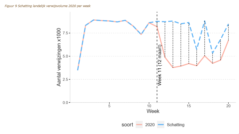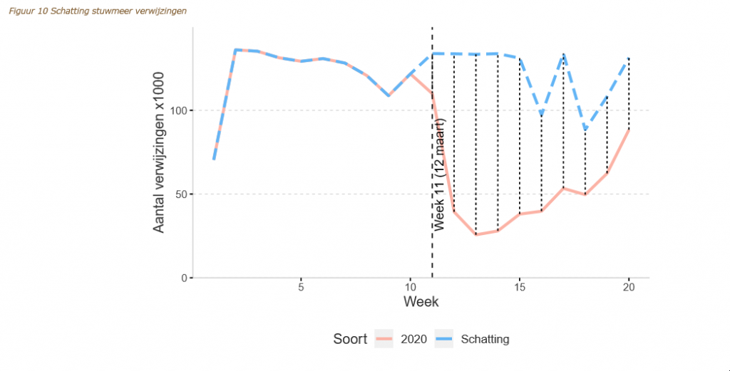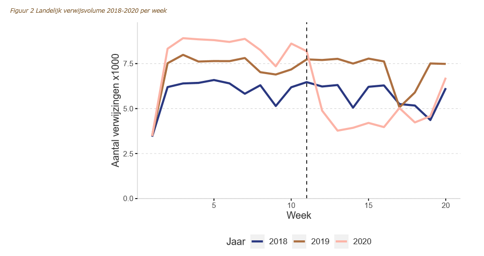 De toezichthouder ziet het aantal verwijzingen wel weer oplopen tot bijna normale niveau’s. Dat is ook te zien in de grafiek hieronder.