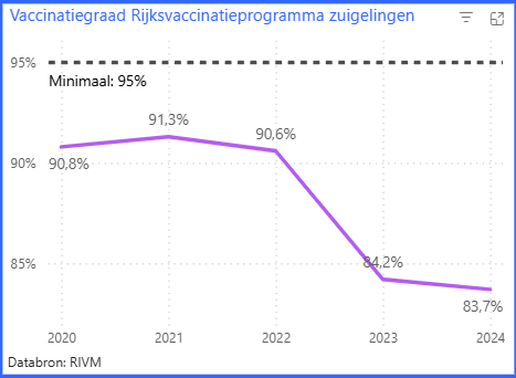 Het dashboard ‘Blik op Nederland’ heeft tien subcategorieën. Een daarvan is zorg. Daarin staan vijf grafieken: het percentage rokers, het aandeel van de bevolking dat voldoende beweegt, de gezonde levensverwachting, de Treeknormen van ziekenhuiszorg en de vaccinatiegraad. Het knop ‘Doelen Coalitieakkoord’ laat zien dat de huidige coalitie zichzelf op vier van de vijf indicatoren een doel heeft gesteld. Dit kabinet wil blijkbaar niet concrete doelen halen op de sterk dalende vaccinatiegraad, die ondertussen al vijf jaar onder het minimum van 95 procent ligt.