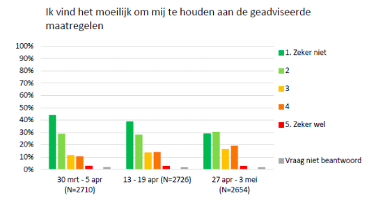 Dat meldt Jaap van Dissel van het RIVM aan de Tweede Kamer. De percentages komen uit een onderzoek van het RIVM en het Nivel. Het lastigste is om 1,5 meter afstand te houden, aldus de ondervraagden.