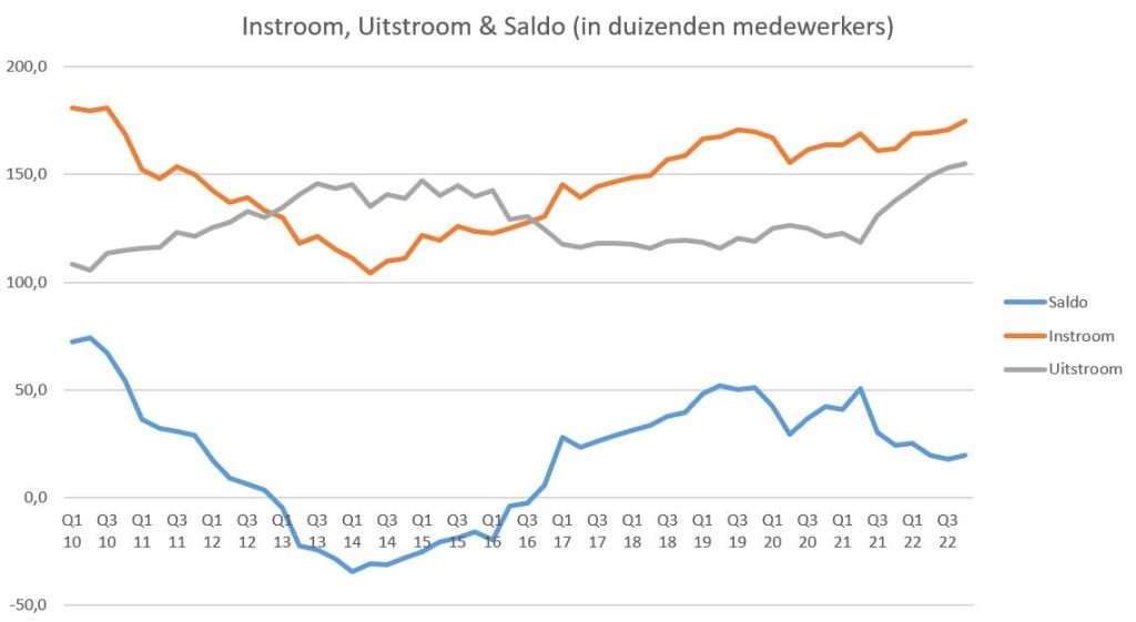 De totale groei van het personeelsbestand in de zorg, door de uitstroom van de instroom af te trekken, is hierdoor een stuk lager dan in voorgaande jaren. Eind 2020 was het saldo nog 42.400 mensen, maar met 19.800 mensen eind 2022 is het sinds 2016 niet zo laag geweest.