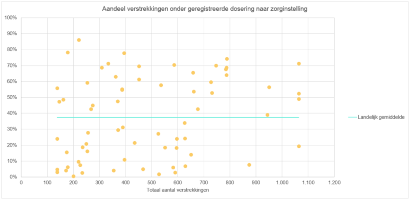 In het rapport staat informatie over of richtlijnen zijn geïmplementeerd ja of nee en zo ja hoe vaak dat gebeurt. Een voorbeeld is ‘efficiënter doseren van pembrolizumab’, een duur geneesmiddel bij kanker. De richtlijn stelt dat patiënten onder de 100 kilo worden gedoseerd op basis van ‘een mg per kilogram dosis met een dosecap’. Uit de aangeleverde data blijkt dat er grote variatie is tussen ziekenhuizen (zie figuur) en dat lang niet alle ziekenhuizen de richtlijn volgen. Kool: “Voor de umc’s geldt dat ze vaak patiënten behandelen die zijn doorverwezen vanuit andere ziekenhuizen. Vaak zijn dat complexere patiënten. Het is dan zoeken naar de juiste dosering en soms wordt dan meer voorgeschreven. In het gesprek met de zorgverzekeraars lichten de umc’s dat toe.”