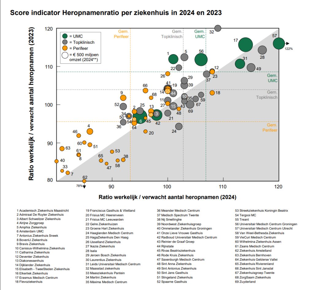 Het gemiddelde aantal heropnames nam af en ook per subcategorie – umc, topklinische en perifere ziekenhuizen – is de gemiddelde score op de indicator heropnamenratio gedaald. Bij de perifere ziekenhuizen van gemiddeld 96 in 2023 naar 93 in 2024, bij de topklinische ziekenhuizen van 104 in 2023 naar 103 in 2024 en bij de umc’s van 109 in 2023 naar 107 in 2024.