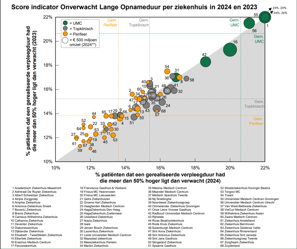 Bij de tweede indicator, onverwacht lange opnameduur, is het gemiddelde percentage onder alle Nederlandse ziekenhuizen in 2024 met 15,4 procent ongeveer gelijk gebleven in vergelijking met 2023.