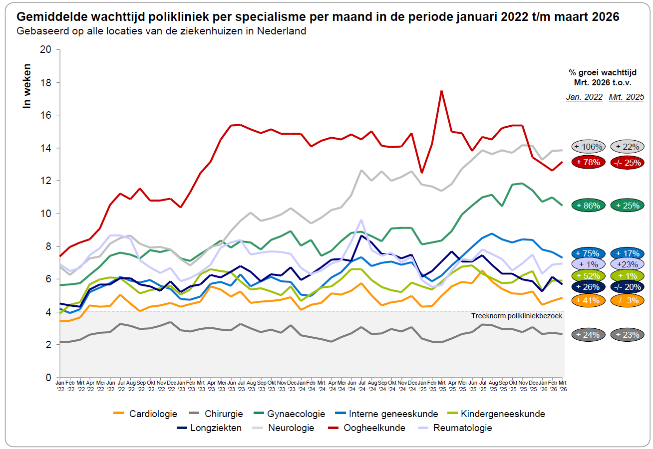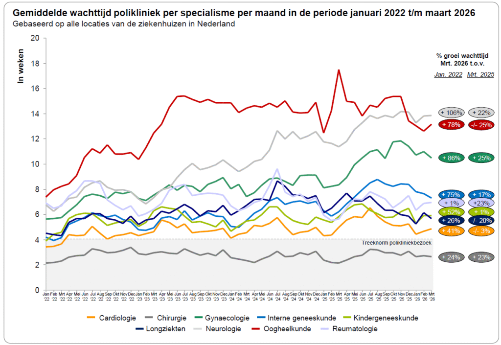 De gemiddelde wachttijd voor een de polikliniek van de neurologie groeide het meest. De wachttijd verdubbelde van 7 weken wachttijd in januari 2022 naar 14 weken in maart 2026. Ook de wachttijden voor oogheelkunde groeide flink. Tegenwoordig moet je voor een poliklinisch oogbezoek in een ziekenhuis gemiddeld ruim 13 weken wachten. Afspraken bij de gynaecologie groeide van een kleine 6 weken naar 11 weken. Interne geneeskunde zat in maart 2022 rond de treeknorm van 4 weken wachttijd, maar die wachttijd groeide de afgelopen jaren naar gemiddeld 8 weken. Voor kindergeneeskunde, longziekten en cardiologie liggen de wachttijden momenteel rond de 5 weken.