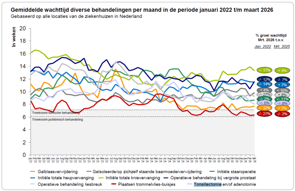 Het goede nieuws is dat er een zeer lichte daling is van diverse veelvoorkomende specifieke behandelingen. Galblaasverwijdering, staaroperatie, knie- of heupvervanging, prostaatoperatie, liesbreukoperatie en het verwijderen van de amandelen – patiënten wachtten in 2022 langer op al die behandelingen dan in 2026.