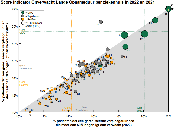 Ook bij heropnames zijn er enkele uitzonderingen. De Ommelander Ziekenhuis Groep, het Zaans Medisch Centrum, Rivas Beatrixziekenhuis en Gelre Ziekenhuizen hebben zich in 2022 juist verbeterd. In de figuren liggen de ziekenhuizen waarbij de ratio wel is verbeterd over 2022 ten opzichte van 2021 in het witte vlak boven de diagonaal.