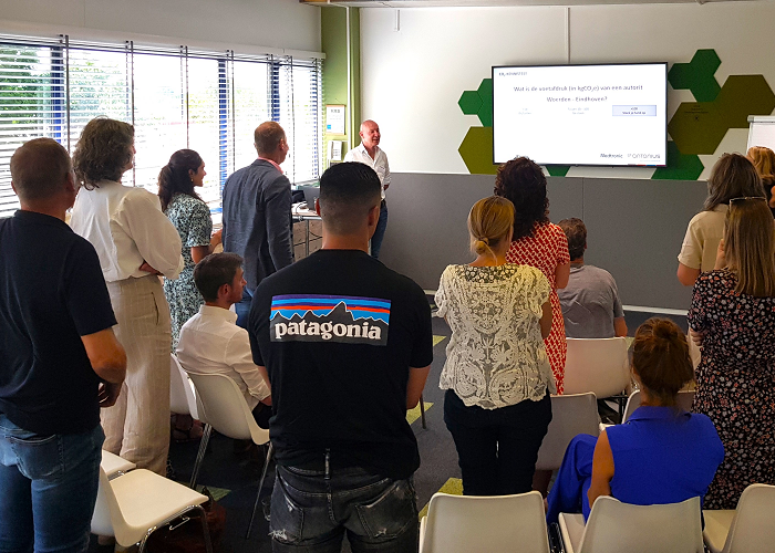 Maar eerst die huidige voetafdruk. Zoiets is nog best abstract. De deelnemers van de sessie van St. Antonius en Medtronic worden daarom gevraagd om spelenderwijs na te denken over de voetafdruk (in kilogram CO2 equivalent[1] uitstoot) van een banaan, een spijkerbroek, een ziekenhuisbed én die van het St. Antonius Hartcentrum op jaarbasis. Die laatste is ongeveer 1.300 ton CO2e, wat gelijk staat aan 215.000 spijkerbroeken of meer dan 16 miljoen bananen! Die totale voetafdruk van 1.300 ton is een schatting, gebaseerd op een beperkt aantal parameters, legt Laura Koot uit. “Dat was een bewuste keuze.” Je kunt wel blijven doorrekenen en inschatten, maar dat moet je niet verlammen om in actie te komen, vult Marc van Manen aan. “We hebben gekeken naar energieverbruik, reisbewegingen en afval.” De conclusies? Energieverbruik heeft veruit het grootste aandeel (845 ton), reisbewegingen ongeveer de helft daarvan en afval in het Cathlab is maar heel weinig (39 ton). “Dat laatste verbaasde ons wel”, zegt Marc van Manen.
