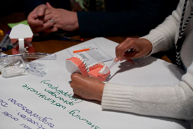 Tijdens de hele dag komt aan bod hoe belangrijk het is om de mondzorg mee te nemen in rapportages, overdrachten en werkoverleg. Een praktische tip is om een foto van het gebit op te hangen in een kast van een cliënt, zodat iedereen meteen weet in wat voor staat dat is en of er wel of geen protheses zijn.
