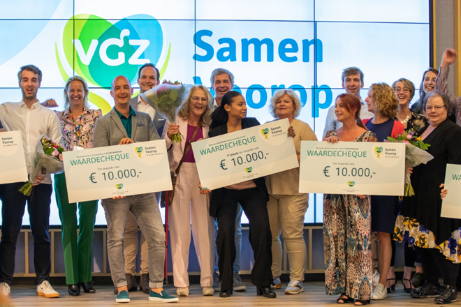 Gastheer Wouter de Jong draaide de normale gang van zaken bij een prijsuitreiking om. Hij riep de vertegenwoordigers van de maar liefst vijftien genomineerde organisaties naar een vol podium. Zo liet hij De Samen Voorop Awards starten met een staande ovatie in plaats van ermee te eindigen. Deze actie leverde een vol podium op. Dit is een consequentie van de keuze van VGZ om hun awards uit te breiden. De Samen Voorop Awards zijn in de plaats gekomen van de Zinnige Zorg Awards. Naast prijzen voor zinnige zorg zijn er nu ook prijzen voor duurzame zorg en gezondheid. Ceo Marjo Vissers van de Coöperatie VGZ legde uit waarom. De drie categorieën sluiten aan bij thema’s uit de nieuwe strategie van de zorgverzekeraar. Om de zorg toekomstbestendig te maken zijn volgens Vissers op al die fronten vernieuwers ‘met durf en doorzettingsvermogen’ nodig.