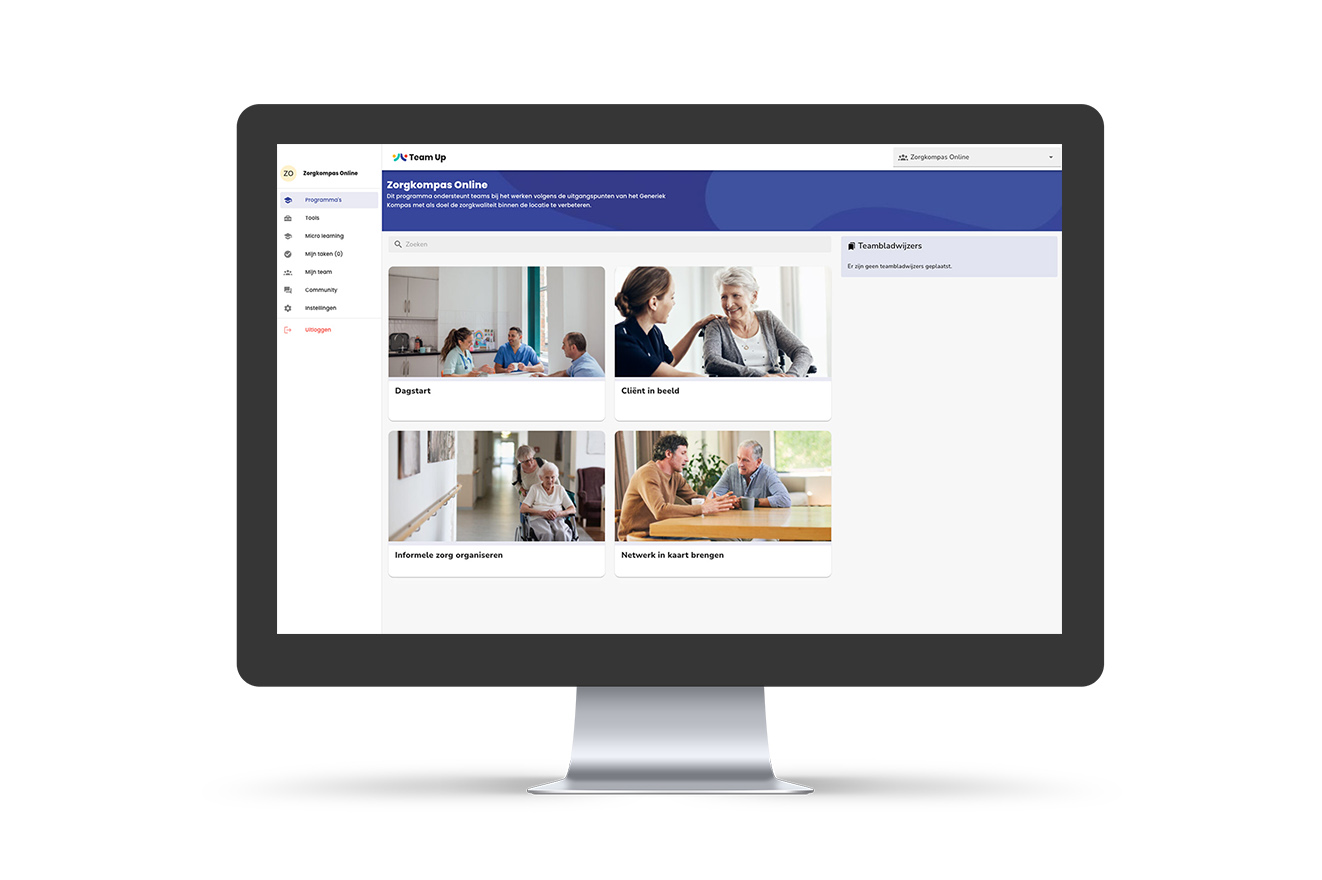 - Begeleide ontwikkeling: de inhoudelijke onderwerpen uit het Generiek Kompas worden middels modules aangeboden op ons platform Team Up, dat fungeert als digitale procesbegeleider. Een interne begeleider, zoals een kwaliteitsverpleegkundige, vult het team aan en maakt de vertaalslag naar de specifieke organisatiecontext.