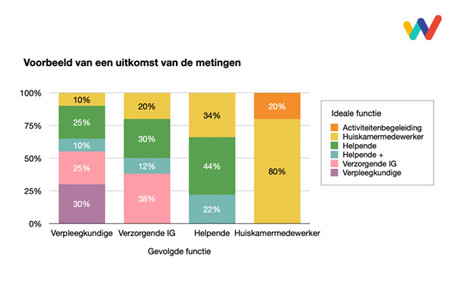 Vraag een verzorgende naar haar werkdag en je hoort een verhaal van drukte en diversiteit. Persoonlijke verzorging, medicatie, overleg, administratie, een praatje met bewoners, koffie inschenken. Maar welke taken vereisen nu echt de deskundigheid van een verzorgende? Dat is lastig te beantwoorden op gevoel. Daarom meten we het. Door medewerkers te volgen tijdens hun dienst en per activiteit te bepalen: welke functie zou dit ideaal gezien uitvoeren?