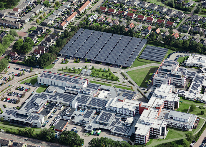 Nij Smellinghe is daar een mooi voorbeeld van. Het ziekenhuis in Drachten loopt voorop als het gaat om het opwekken van het eigen stroomverbruik. Minimaal 30 procent van de energiebehoefte wordt opgewekt door negenduizend zonnepanelen. Die liggen op drie verschillende locaties: deels op het dak en deels op een stukje ongebruikte grond naast het ziekenhuis. Maar het merendeel van de zonnecollectoren ligt op de overdekte parkeerplaats. “Zorginstellingen beschikken doorgaans over grote parkeerplaatsen. Door die te overkappen win je ruimte voor zonnepanelen. Tegelijkertijd bied je bezoekers comfort doordat ze in de schaduw parkeren. Als GroenLeven kijken we graag naar dit soort dubbel ruimtegebruik.”