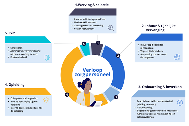 Bij werving en selectie komen niet alleen de personele kosten van recruitment kijken, maar ook de afname van gesprekken, meeloopdagen en de materiële kosten van een wervingscampagne. Tot een nieuwe zorgmedewerker is gevonden, wordt er vaak een zzp’er ingehuurd om de vertrekkende professional tijdelijk te vervangen. Diploma’s en de VOG moeten worden gecheckt en de roosters moeten vervolgens worden aangepast.