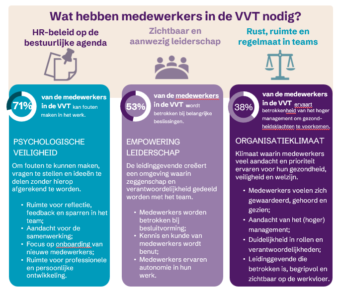 Ook zien we dat jonge zorgmedewerkers in de VVT vaker de sector verlaten dan oudere collega’s. Uit onderzoek weten we dat een gezond organisatieklimaat, empowering leiderschap en psychologische veiligheid essentieel zijn voor het werkplezier, de bevlogenheid en daarmee het behoud van zorgmedewerkers in de VVT. En juist daar is ruimte voor verbetering.